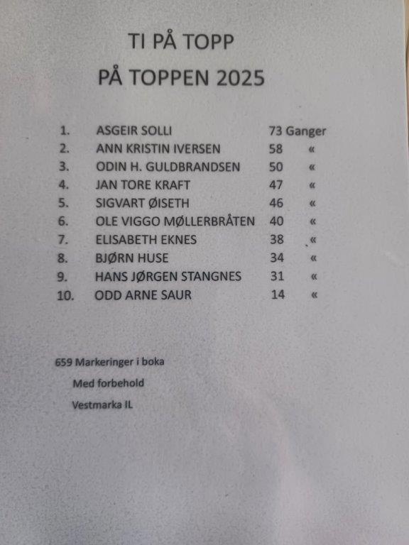Asgeir Solli var flest ganger på Vardåsen (iallfall av de som skrev seg i boka) i 2025, hele 73 ganger. Sprekt!. Også i 2021 var Asgeir den med flest «noteringer». De to siste «pallplassene» gikk til Ann Kristin Iversen og Odin Huse Gulbrandsen, gratulerer.